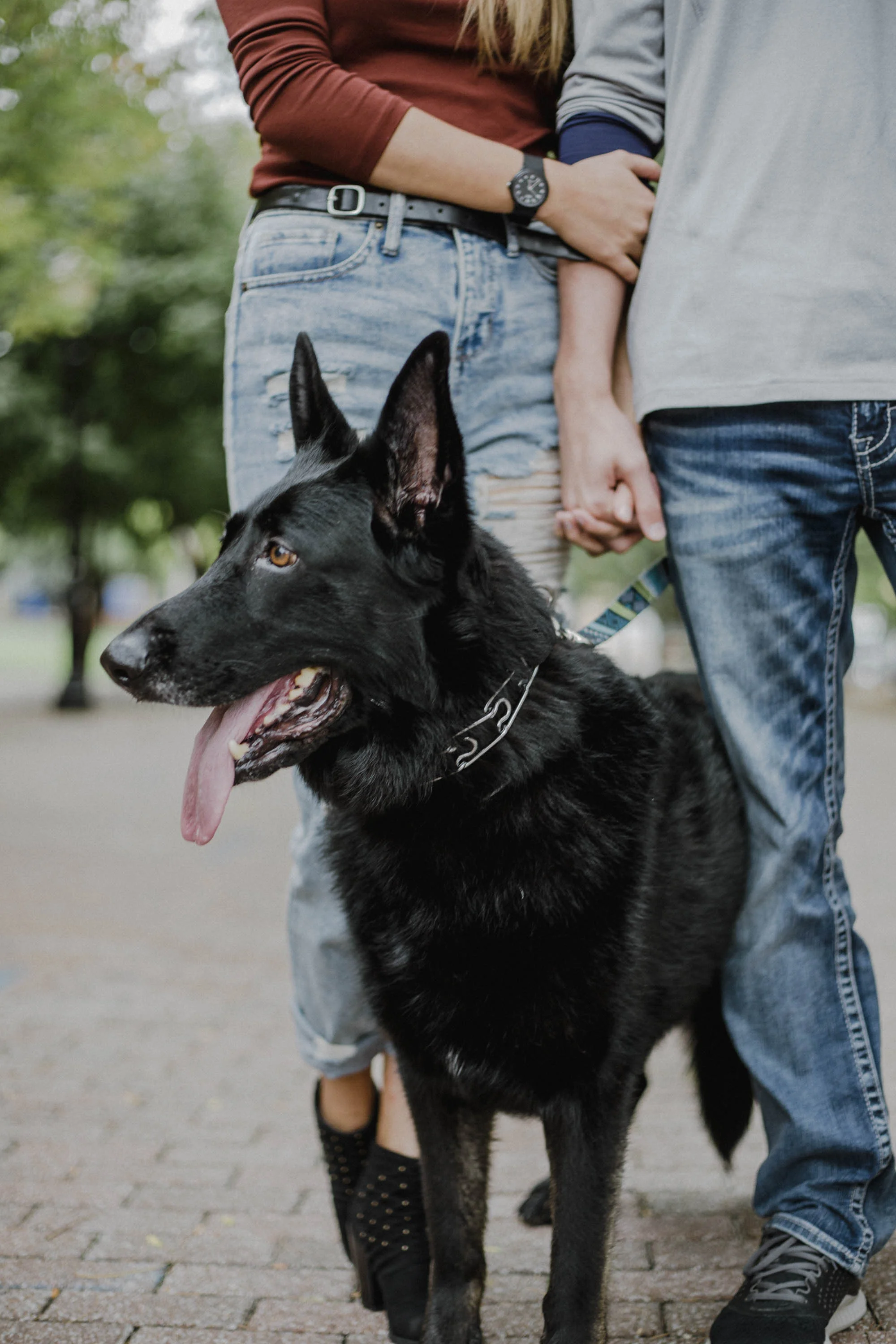 As the couple walked my way, their German Shepherd was out in front. Emily had texted me earlier that morning asking if she could bring their dog, Addi, and obviously I said yes. Dogs are a part of the family. Not only does a dog help their owners relax, but it also calls for more candid photos, which are my FAVE. Addi was a hoot. All she wanted to do was check out all the other dogs that were out and about that day and she definitely let you know about it. I think my favorite thing about her was the way she walked while on her leash: never in a straight line and always making sure you were behind her so she knew she wasn’t alone. She was entertaining and so fun to have for photos. *Shout out to Michaela Remijio for helping significantly that day*
